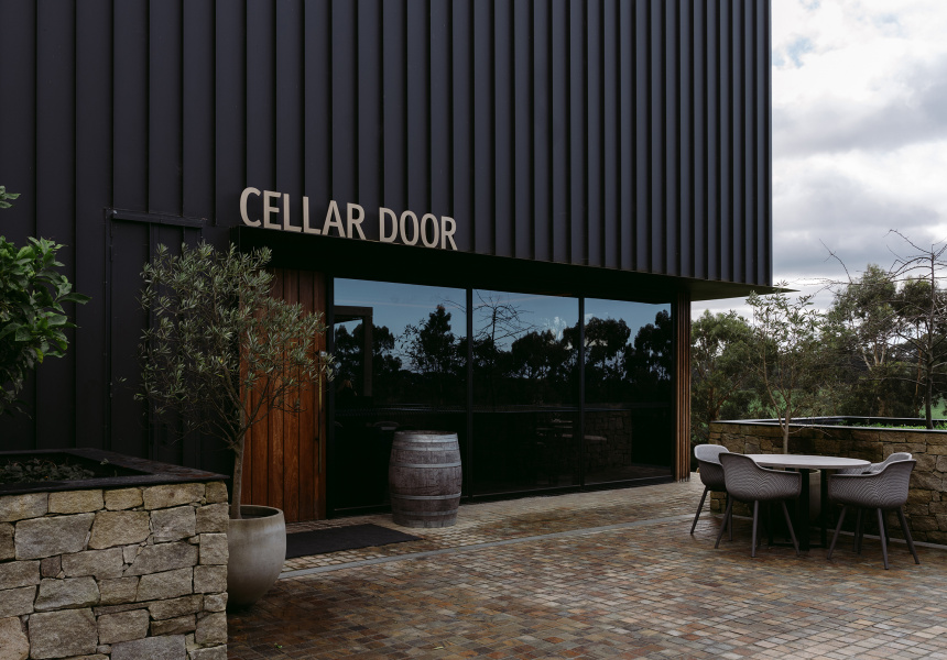 The bar’s interior blends its namesake machine’s signature shade with charcoal walls and honey-hued timber tables. Cathedral ceilings and tall windows create an expansive feel in the otherwise cosy venue, which also features handmade bricks with a sunset colour inspired by the soil at the estate’s 23-year-old Coolart Road Vineyard.